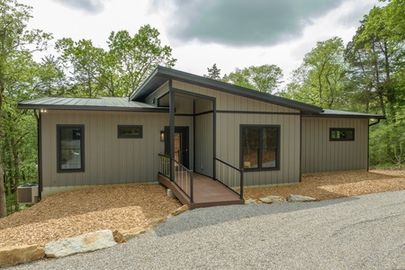 Designed with relaxation and entertainment in mind, this NEWLY CONSTRUCTED treehouse is able to accommodate 8 guests comfortably in 3 bedrooms and 2 full bathrooms. The modern, high-end property features an open floorplan with a fully equipped kitchen and oversized island, quartz countertops in the kitchen and bathrooms, stainless steel appliances, dining area, custom soft-close cabinetry, and tall windows lining each elevation with stunning birds-eye views.