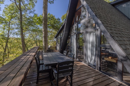 This chalet comfortably accommodates up to 8 guests with one bedroom, bathroom, and an upstairs loft with additional sleeping space. Enjoy time in the spacious living room with vaulted ceilings and a wood burning fire place, or open the sliding glass doors to the screened in porch for panoramic views of the surrounding wooded wonderland. The recently updated kitchen sparkles with custom cabinetry, all new stainless steel appliances, and is fully equipped with everything you need for all of your meal preparations!