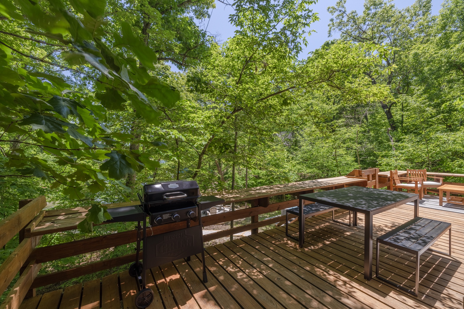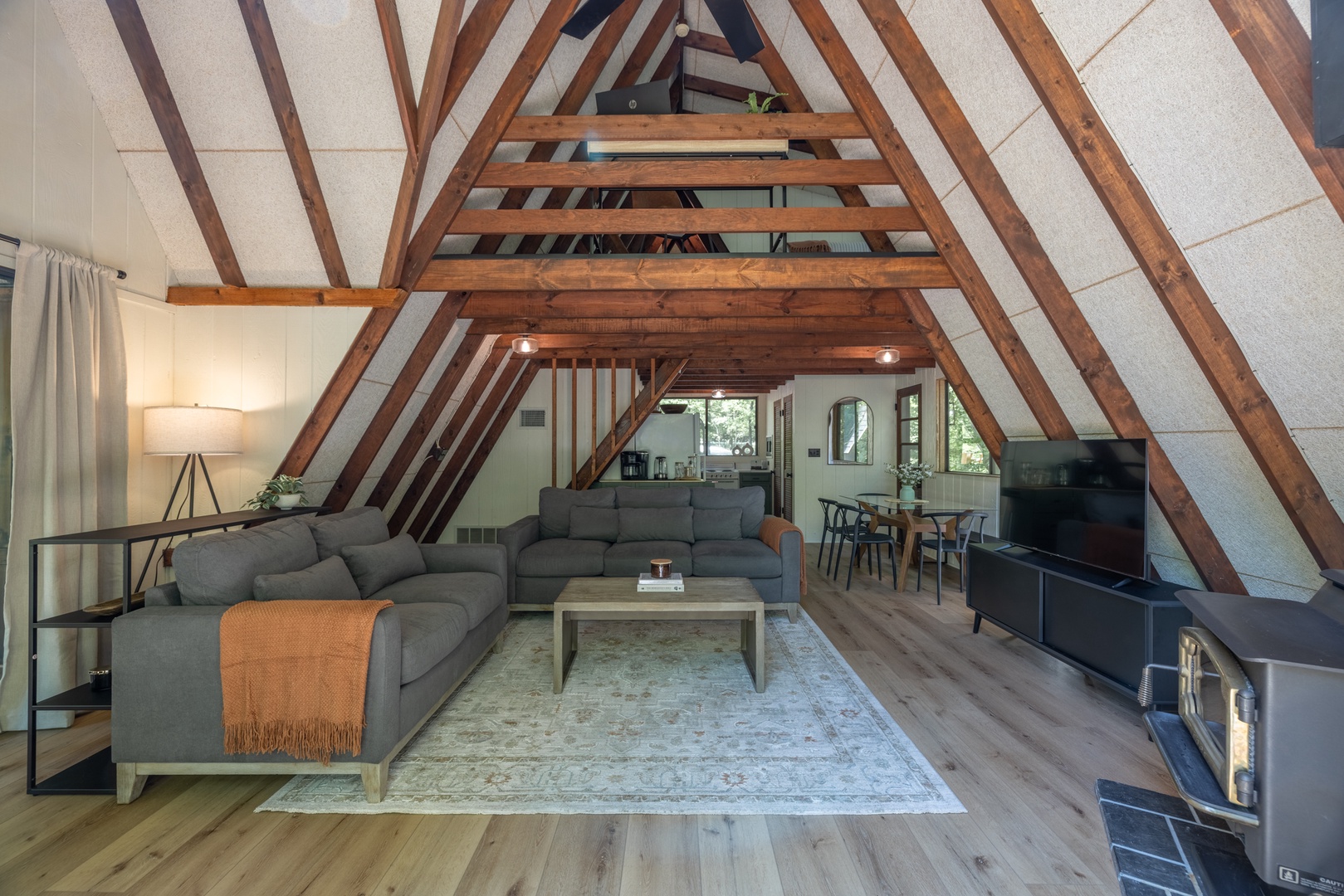 • Roomy living area with a wood burning stove/fireplace, plush furniture, TV, and sliding glass doors to the back deck